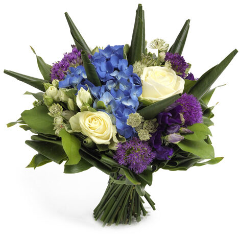 Een prachtig blauw met wit boeket dat iedereen zal bekoren! Schitterende blauwe hortensia’s en witte rozen, gemengd met kleine, paarse bloemen en tropische bladeren in kegelvorm.